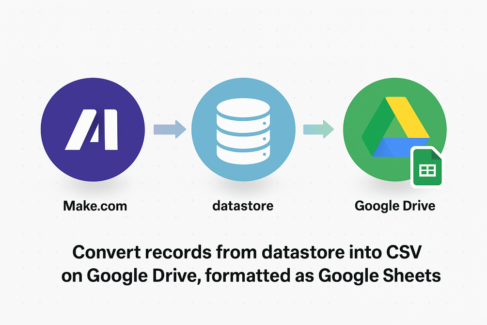 Easily convert your datastore records on Make.com into organized, ready-to-use Google Sheets in just one automated workflow. This powerful Make.com automation fetches all records from your selected Data Store, transforms them into a CSV file, and uploads it directly to your Google Drive—automatically formatting it as a Google Sheet for immediate access and collaboration.